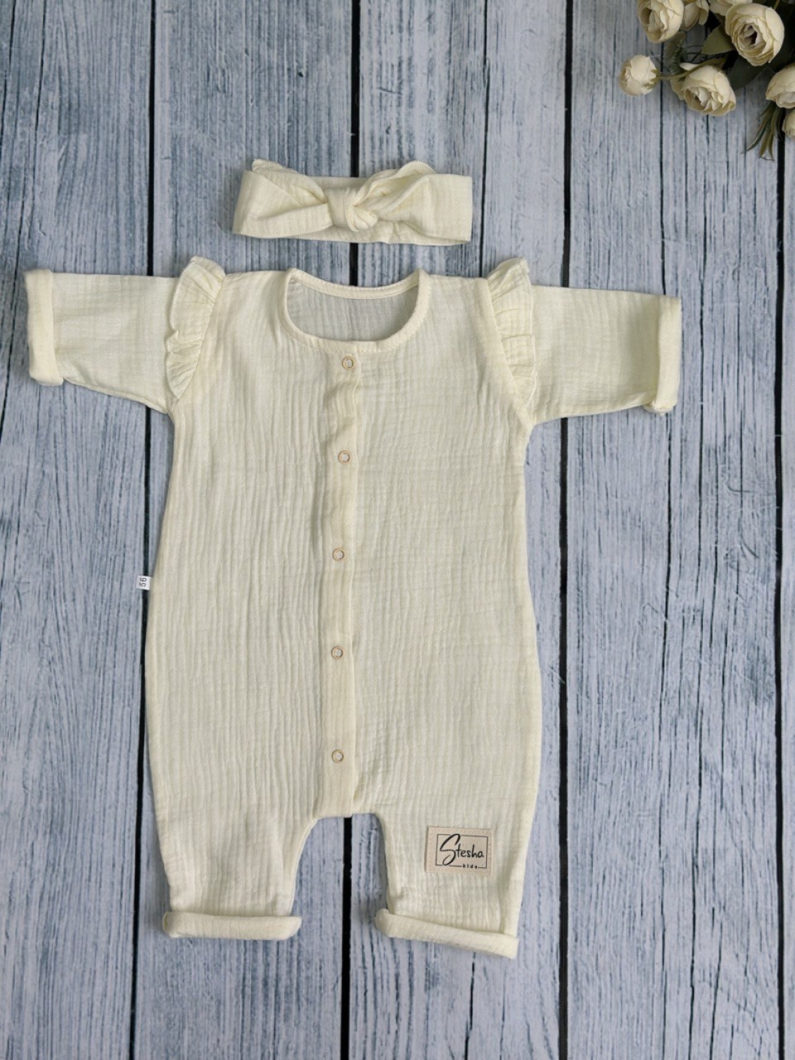 Купить оптом 338-БЕЖ. Комбинезон детский из муслина, хлопок 100%, размеры 56,62,68, бежевый в Калуге