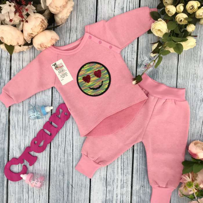Костюм из ткани футер с начесом украшен переливающимся Смайликом