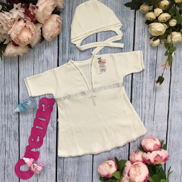 Купить оптом 169. Крестильная рубашка с чепчиком (серебро), хлопок 100 % интерлок 62,68,74,80 в Калуге