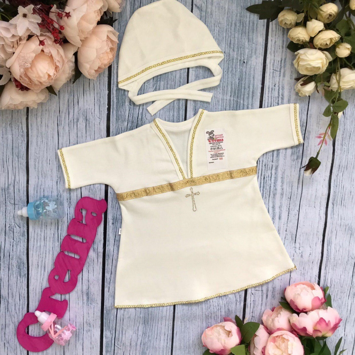 Купить оптом 170. Крестильная рубашка с чепчиком (золото), хлопок 100 % интерлок 62,68,74,80 в Калуге